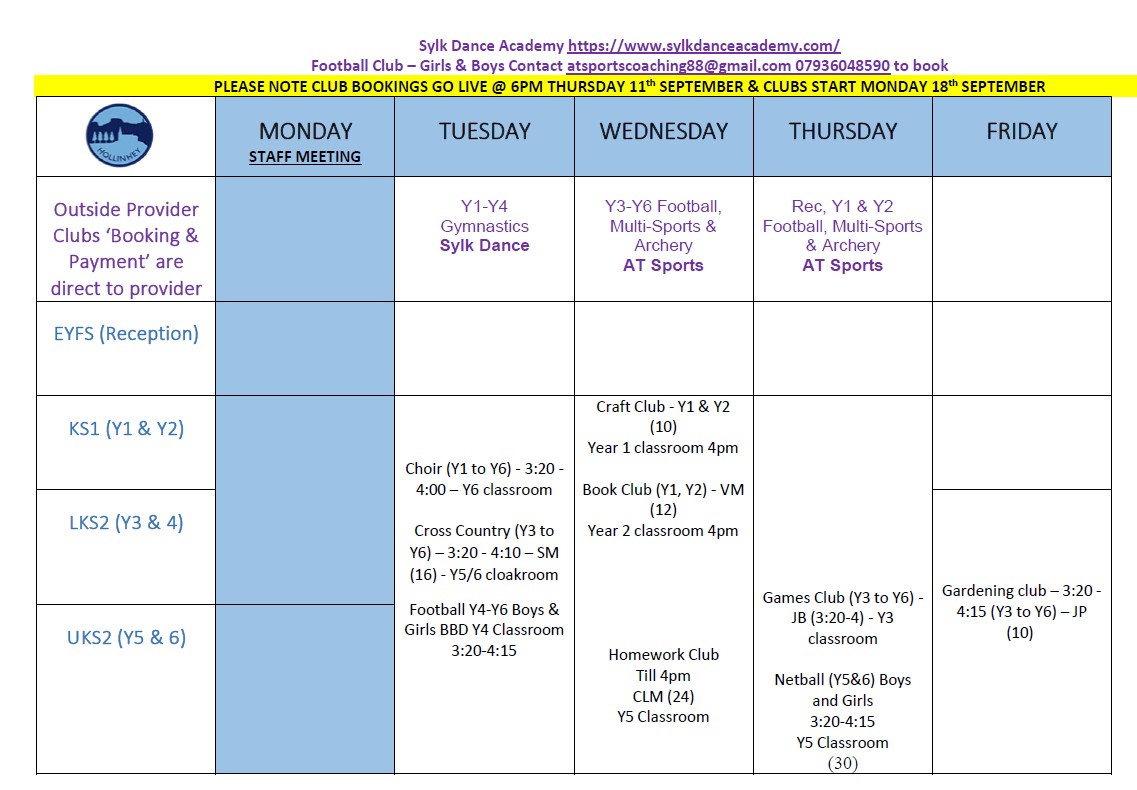 At Hollinhey, teaching staff give up their own time to provide a variety of extra curricular opportunities throughout the academic year. Below is the timetable for the 'free' Afterschool Clubs provided by the school for Autumn Term 1 WC 15th September 2025. Some clubs, which are highlighted in purple are taken by an outside agency and there is a fee to pay.