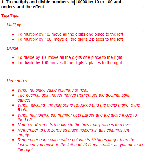 The attached file will help to remind you how to multiply and divide by 10 100 & 1000.